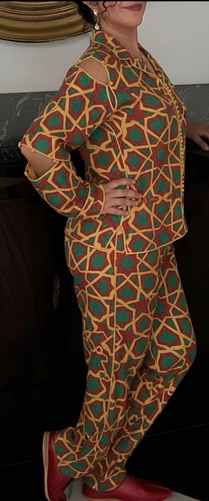 Tunique unique design Lamia By Lamia cousue main avec les motifs Zellige LBL. Mise en valeur du savoir faire marocain ancestral.